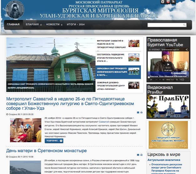 Почему же важнейшее духовное событие не удостоилось не только проповедей и назиданий, но даже простейшего упоминания? Быть может, просто сайтами занимаются люди несведущие, а у духовного начальства много забот, и, как говорится, «не доходят руки»? Или Интернет для них, что называется, терра инкогнита? Что ж… для этого у нас есть «продвинутые» архиереи, знающие сеть не понаслышке и даже ее активные пользователи. Таких не много, но они есть. Особенно в этом плане выделяется на общем фоне митрополит Улан-Удэнский и Бурятский Савватий. Он активный участник Фейсбука, причем не только в обновлениях статуса, но и в комментариях к статусам других пользователей, доступен для неформального и живого общения. Вот как раз там, на своей странице он опубликовал видео проповеди на последней церковной службе. В ней архипастырь немало места посвятил начавшемуся Рождественскому посту, при этом очень эмоционально обратился к пастве с призывом звать «всех знакомых и друзей» на «генеральную уборку», как он метафорически называет пост. В том числе упомянул и о воздержании в этот период от «пустого времяпровождения» в социальных сетях. Прекрасно. Но не на блуждающего ли по сетям должен быть рассчитан в первую очередь епархиальный сайт? Открываем сайт Бурятской епархии и видим… маленькое региональное подобие патриархийного «старшего брата»: