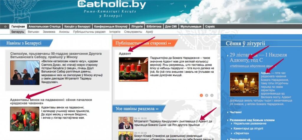 Как и следовало ожидать, на главной странице портала многократно упоминается Адвент (указано стрелками): от разъяснений и пастырских назиданий до связанных с этим периодом церковных обычаев.